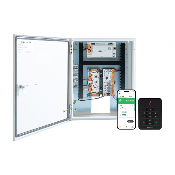 Ideal for small to medium business security upgrades and new installs, it complies with the Gallagher SMB architecture and offers a metal mounting plate with ducting, pre-terminated wiring looms, and included 4k7 resistors, making it suitable for professional commercial environments.