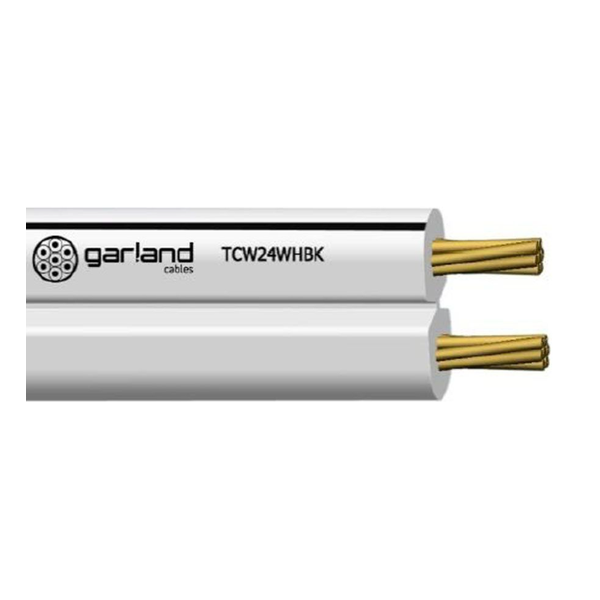 The GARLAND TCW24WHBK250W is a commercial-grade Figure 8 twin-core cable designed for reliable power and low-voltage wiring in electronic and allied equipment, extension speakers, and security system installations. Supplied as a 250m reel, it features stranded 19AWG PACW conductors (24/0.20, 0.75 mm2) with V-75 PVC insulation and a durable unscreened PVC sheath, delivering a compact 2.7 x 5.4 mm nominal OD for easy routing in tight spaces.